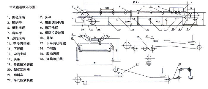 電氣保護可設有:輸送帶跑偏監(jiān)測器;輸送帶打滑監(jiān)測器;輸送帶縱向撕裂信號監(jiān)測器;料位控制監(jiān)測器等。帶式輸送機外形圖